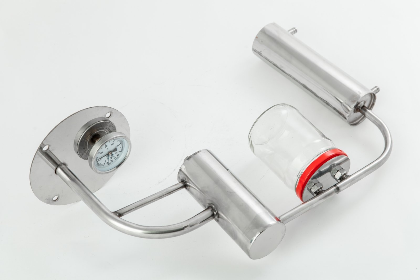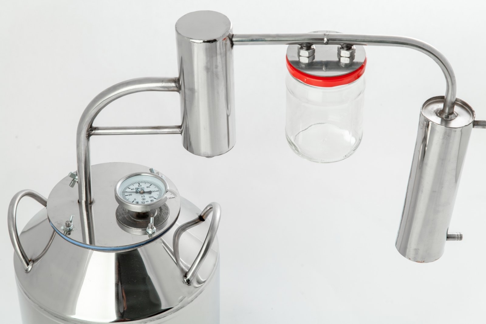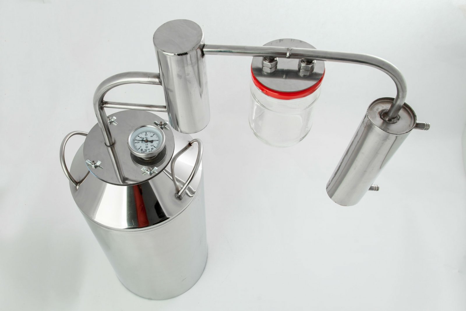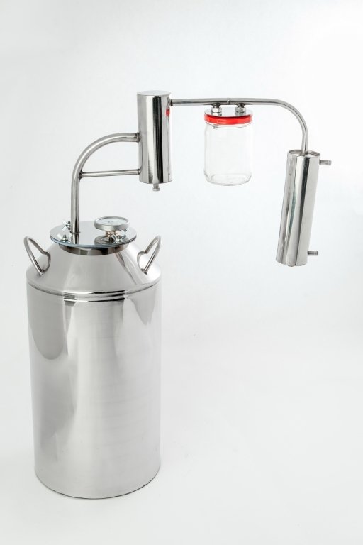 Комплектация: перегонная емкость (кастрюля для браги), с широкой заливной горловиной; вертикальный змеевик, для охлаждения спиртосодержащего пара; классический сухопарник со сливным отверстием для слива сивушных масел и очищения продукта от вредных примесей с укрепляющим эффектом; разборный сухопарник - под стеклянную банку, в такой сухопарник можно заложить ароматические ингредиенты (апельсиновые корки, травы) таким образом можно придать напитку эксклюзивный и элитный аромат и вкус; термометр; прокладка, для герметизации аппарата в соединении: крышка - куб.